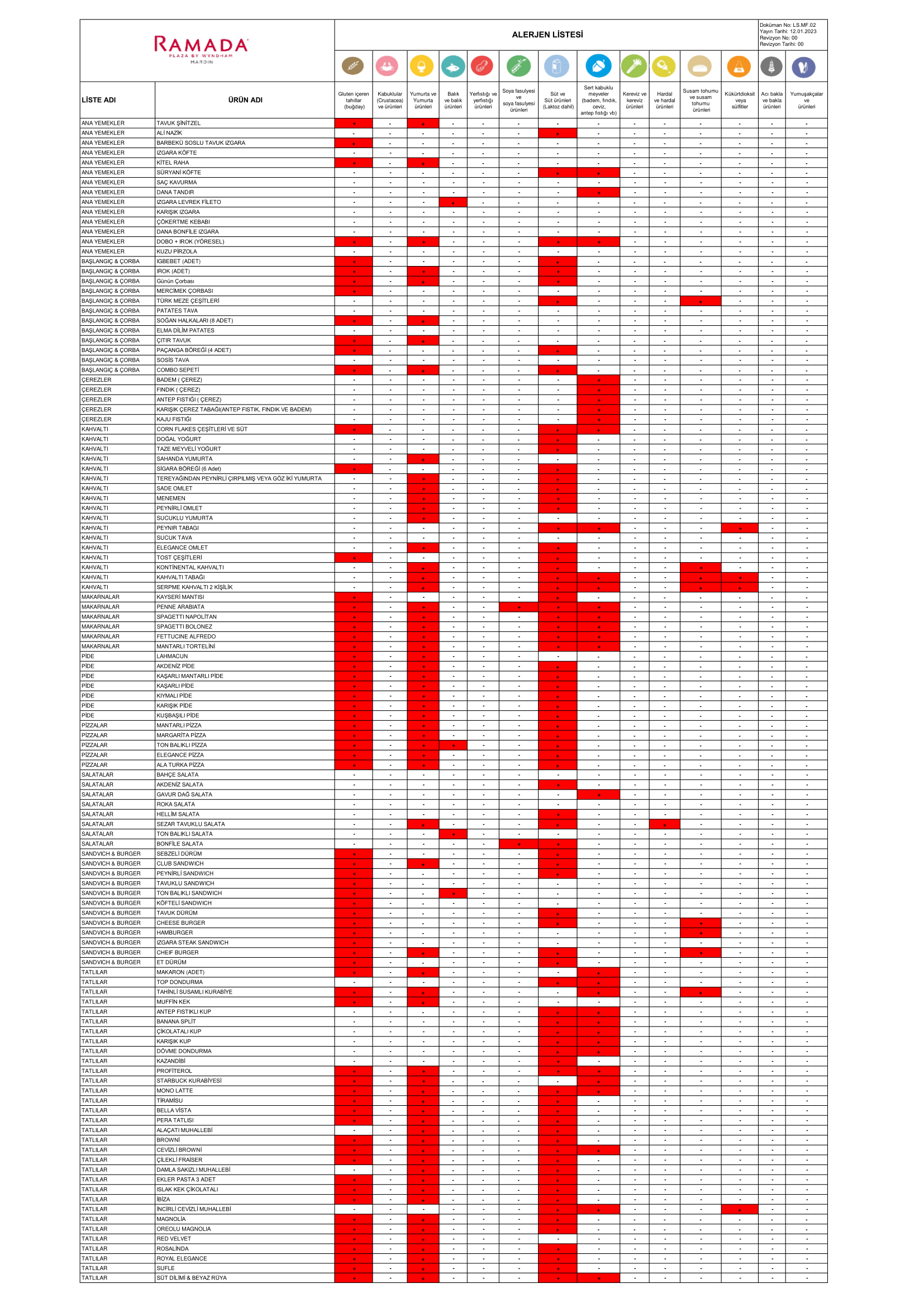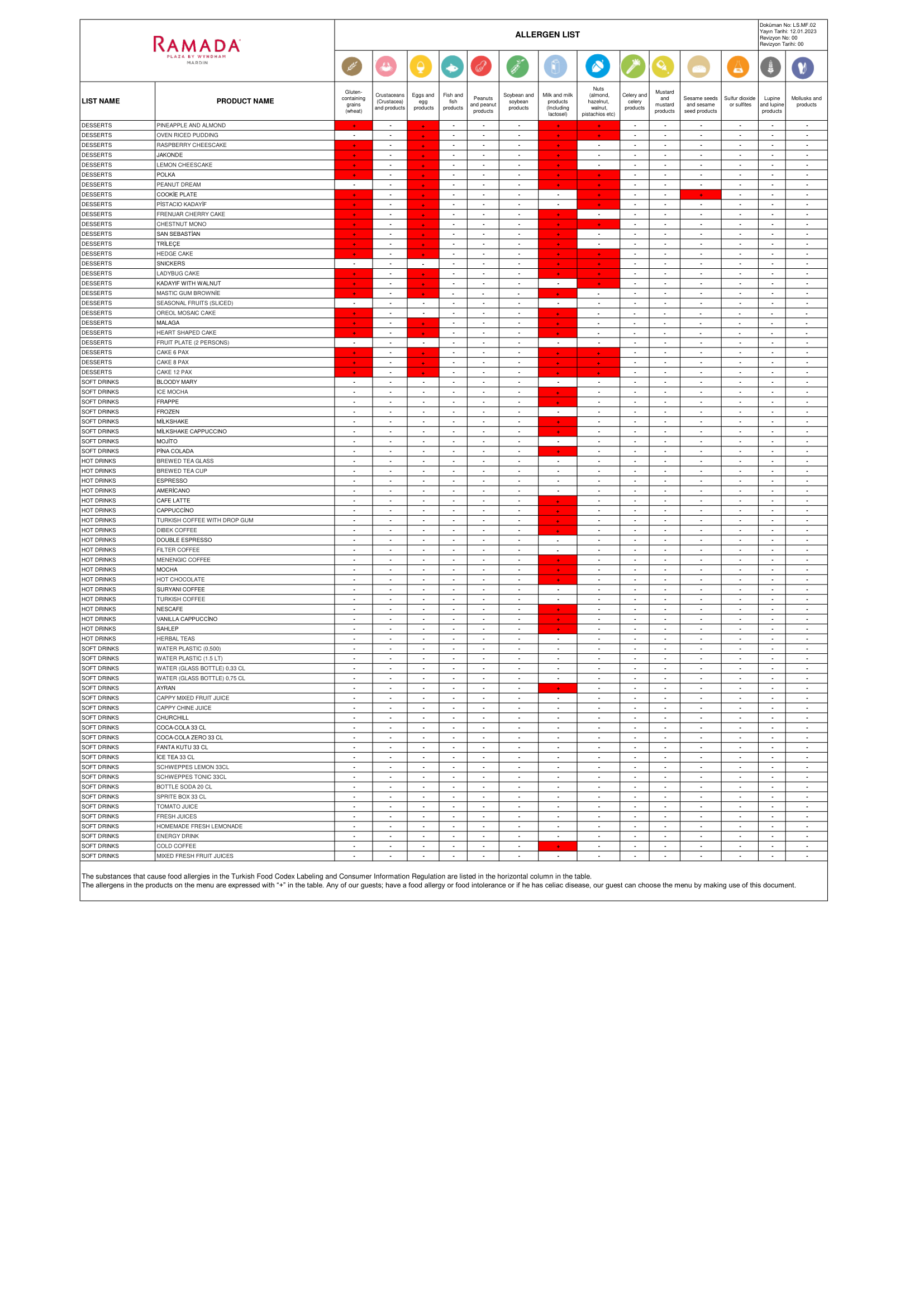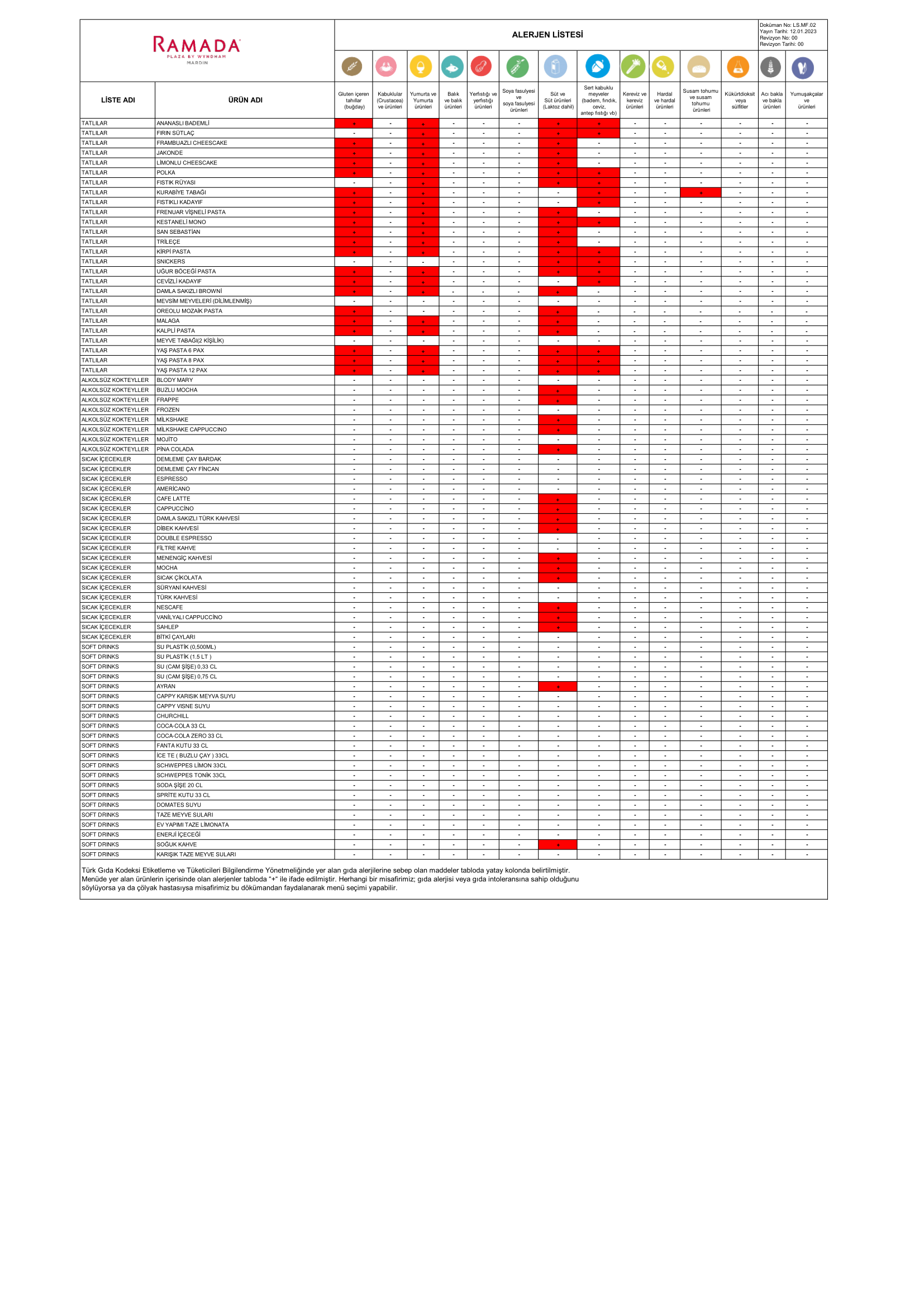 DEĞERLİ MİSAFİRLERİMİZ; GIDA ALERJİNİZ VARSA SİPARİŞ VERMEDEN ÖNCE ALERJEN LİSTEMİZİ İNCELEMENİZİ RİCA EDERİZ.